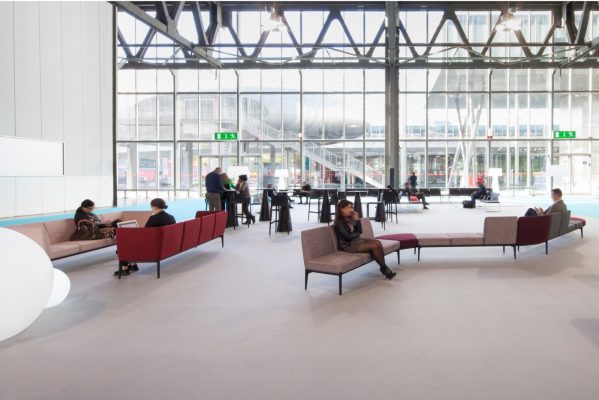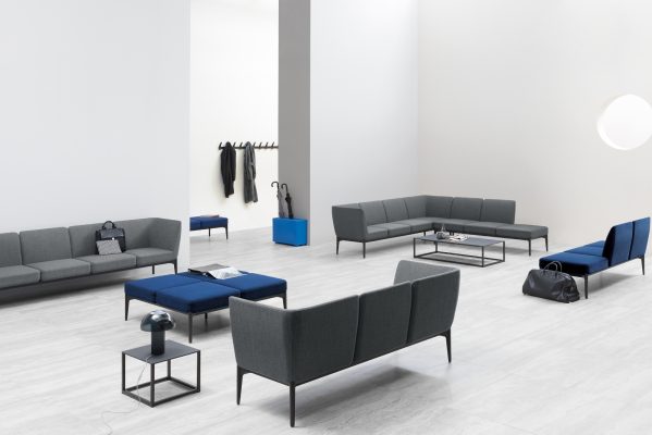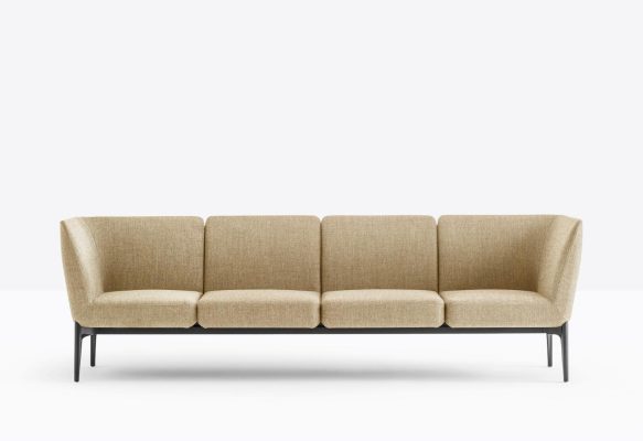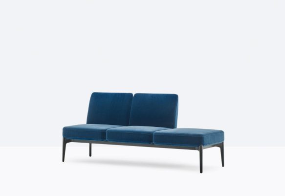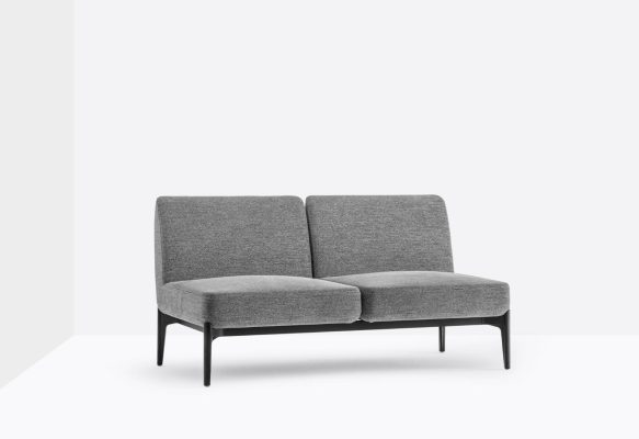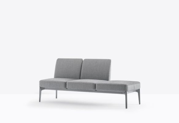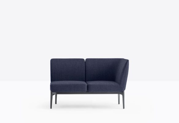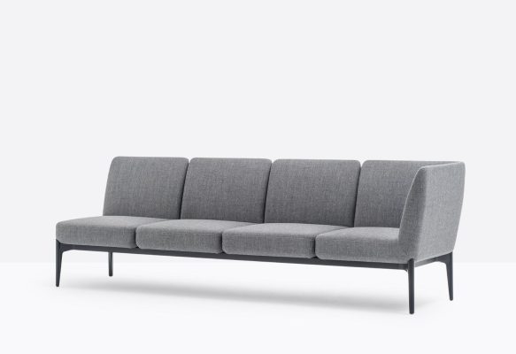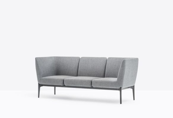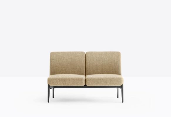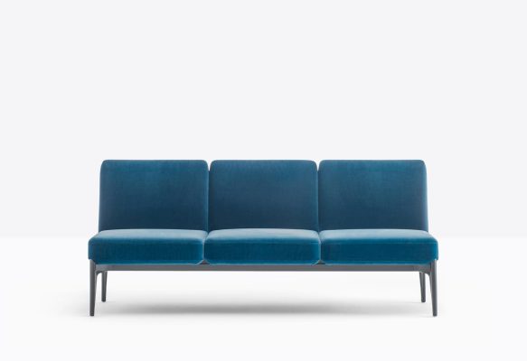 Estrutura metálica. Assento e encosto em espuma revestida em pele sintética ou tecido.